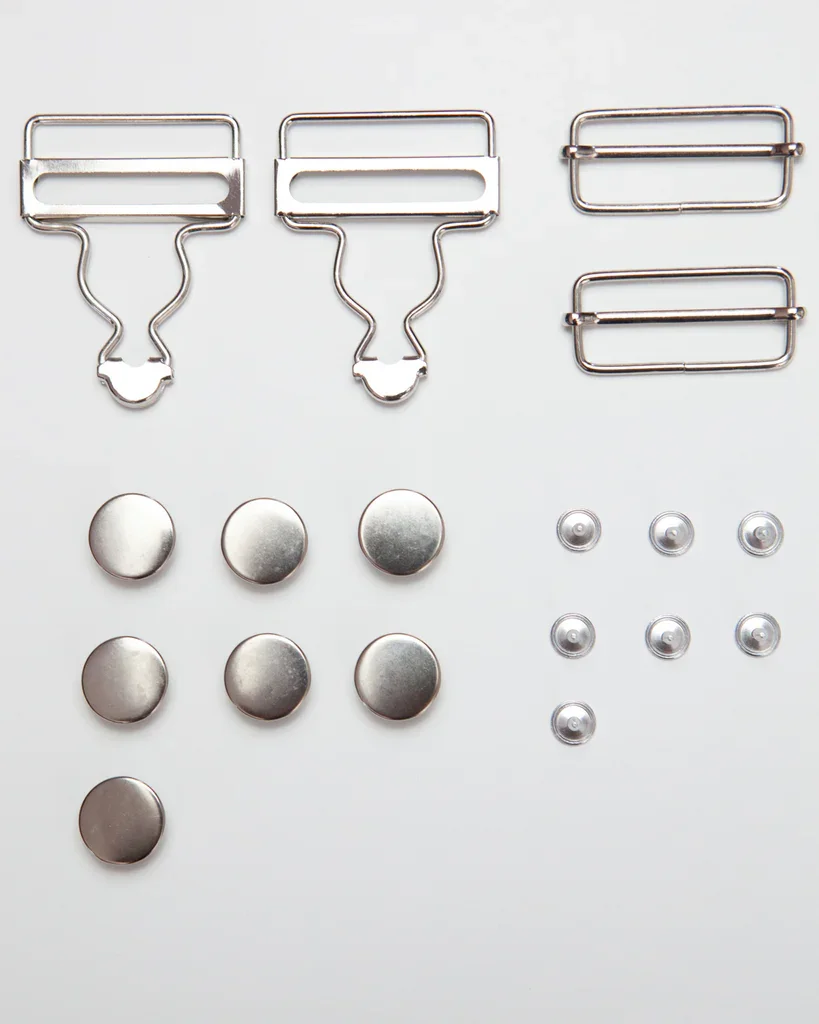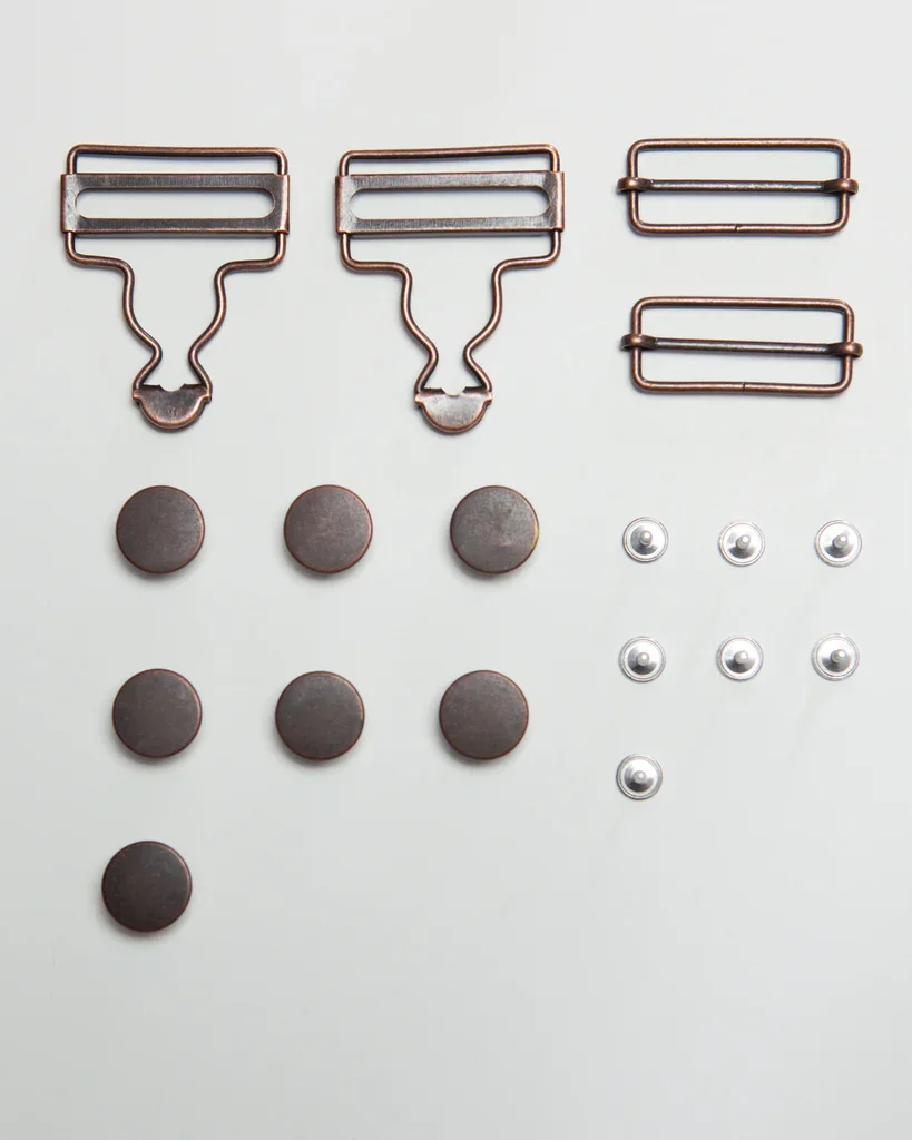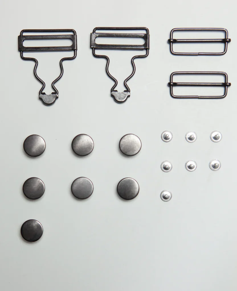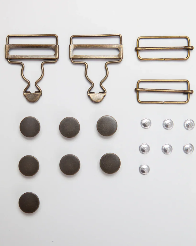 Note: At checkout, you can select options to make your overalls using traditional sew-on buttons ($145), or add on a kit with metal buttons/buckles ($160). To use the metal button/buckles, please register at least 2 weeks before the start of class to allow time to order your kit. Finish examples are shown below (click photos to enlarge).
